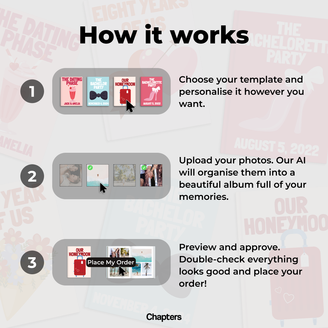It’s simple! Choose your theme from over 100+ options, then upload your photos in bulk. The AI-assisted editor selects the best layout for your images, and your couple memory book will be ready to preview and order in minutes.