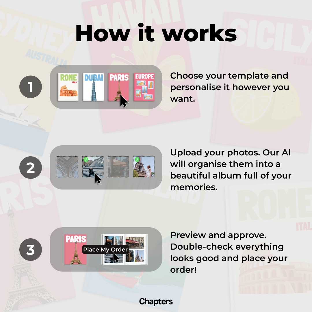 Creating your personalised travel photo book is simple! Choose from over 100 theme options, then upload your photos in bulk. Our AI-assisted editor will automatically select the best layout for your images, ensuring your vacation photo book is perfectly arranged and ready for you to preview and order in under 2 minutes.